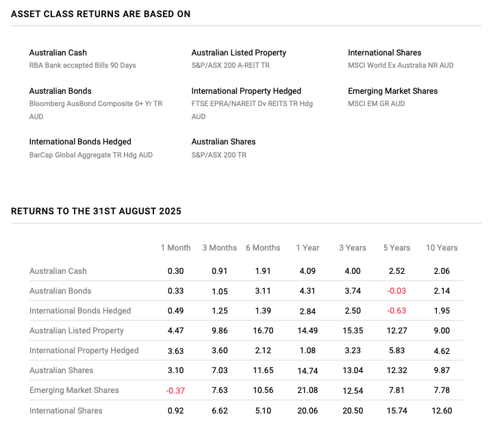 Share and bond prices increased in August following a better profit reporting season in the US and a softer reading in labour force data suggesting a reduction in interest rates is imminent. The Australian share market increased by 3.10% and global shares by 2.1% as represented by the MSCI World Index in Australian dollar terms. Australian Listed Property and International Property returned 4.47% and 3.63% respectively. Bond prices slightly underperformed the cash market as bond yields remained under pressure on fears of inflation will remain high in the US driven by the tariffs.